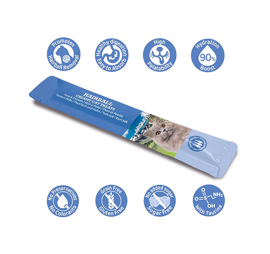 Um lanche em forma de purê cremoso, projetado para ajudar a controlar as bolas de pelo. A fórmula com sementes de cevada (0,8%), fibra (1%) e 90% de hidratação favorece a eliminação das bolas de